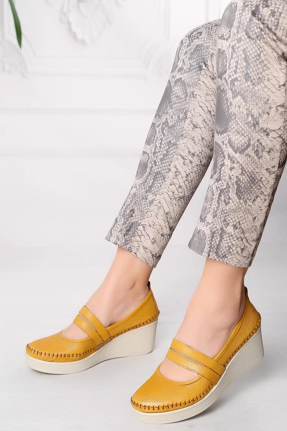 Artı-Artı014-14153-1 Hakiki Deri Ortopedik Kadın Platform Topuk Sarı Ayakkabı.