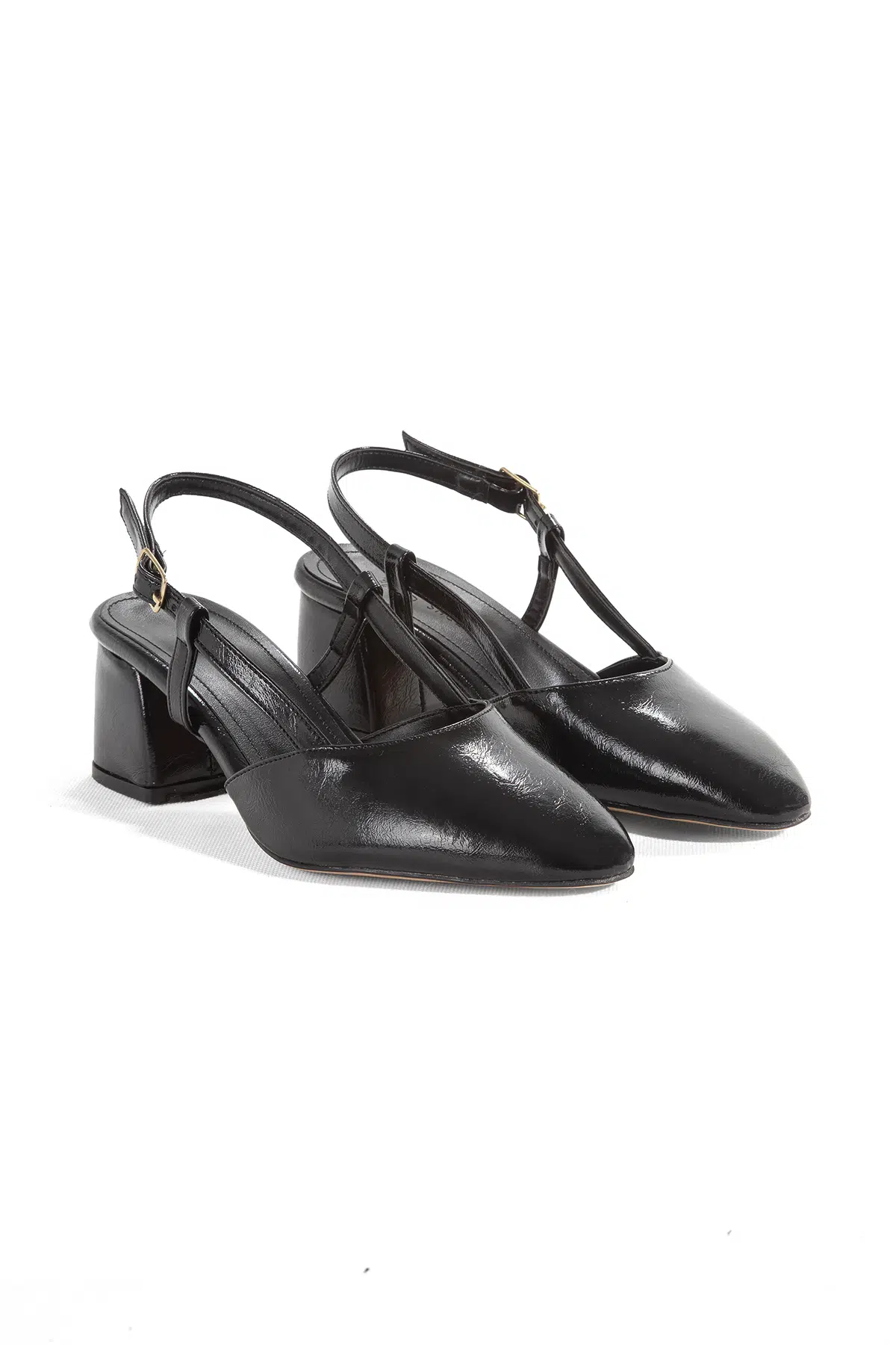 Siyah Kırışık Rugan Kaplama Kalın Topuklu Ayakkabı