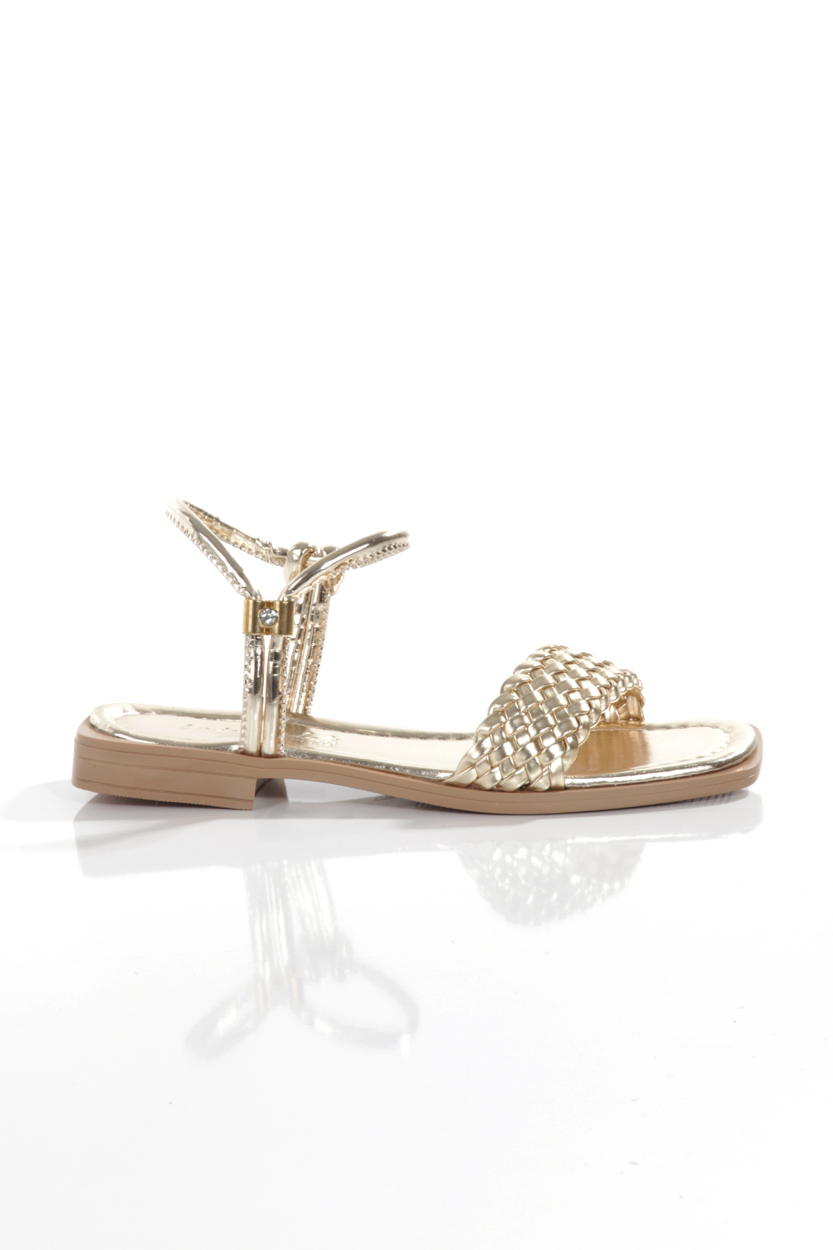 İmia sandali ile tanışın - Altın rengi biyeden yapılmış, elde örülmüş üst saya ve içi komaz ip ile destekli saraç örgülü biyeden yapılmış arkalığı ile zarafeti ayaklarınıza taşıyın. Her adımınızda parlayan kristal taş detaylı toka ile bileğinizde lüksün ve şıklığın keyfini çıkarın.